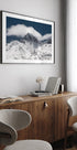 Snødekte tinder reiser seg mot en klar, blå himmel i et rolig vinterlandskap. Tåkedotter og lange skygger gir dybde, mens skarpe konturer fremhever fjellenes kraft. Motivet er fotografert av Xiaoyang Wang og inviterer til stillhet, ettertanke og frisk luft i hjemmets mest harmoniske rom. Passer særlig godt til stue, soverom og hytte.