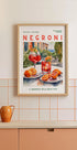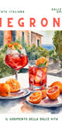 En livlig akvarellplakat som hyller den ikoniske Negroni-cocktailen, satt mot en drømmende italiensk sommerbakgrunn. Med solmodne appelsiner, forfriskende drinker og et snev av middelhavssjarm, fanger kunstverket essensen av la dolce vita—perfekt for kjøkkenvegger, barer eller alle som elsker tidløs italiensk stil.