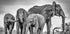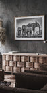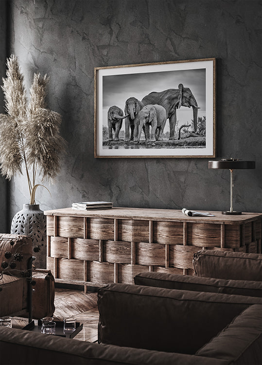 Dette kraftfulle svart-hvitt-viltfotografiet viser en elefantfamilie samlet ved et vannhull. Med ømme interaksjoner mellom unge og voksne elefanter gjenspeiler det temaer som beskyttelse, enhet og naturens majestet — et tidløst kunstverk som feirer styrke, familie og villmarken.