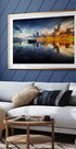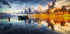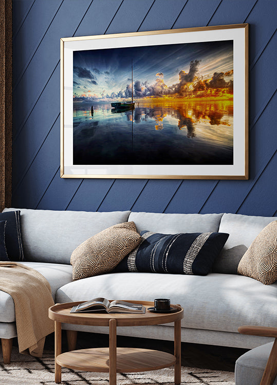 Dette fantastiske sjølandskapet fanger en enslig seilbåt som hviler på stille vann under en dramatisk solnedgangshimmel. Refleksjonene av gyldne skyer bølger over vannflaten og forener ro med storhet, og skaper et tidløst maritimt kunstverk som utstråler fred, stillhet og naturlig skjønnhet.