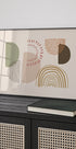 Plakaten viser en abstrakt komposisjon med geometriske former i ulike farger som grønn, rosa, beige, og brunt mot en lys bakgrunn. Formene inkluderer halvmåner, sirkler og buer, skapt med ulike mønstre og strukturer, som gir en moderne og lekfull estetikk.