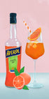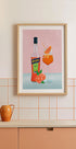 En frisk og livlig illustrasjon av Aperol Spritz, med en flaske, sitrusfrukter og et cocktailglass med is og appelsingarnityr mot en myk rosa bakgrunn. Lekent og fargerikt, dette kunstverket fanger essensen av italiensk sommer og aperitivo-kultur, perfekt for kjøkken, barer og sosiale rom.