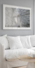 En fengslende plakat av en hvit påfugl med fjærene fullt utslått, som utstråler renhet og eleganse. Den slående komposisjonen fanger fuglens majestetiske skjønnhet i rolige detaljer og gir en følelse av fantasi og engleaktig ynde. Et blikkfang som kombinerer naturens under med kunstnerisk raffinement.