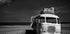 Et stemningsfullt sort-hvitt fotografi av en forlatt vintagebuss strandet på en sandstrand. Med slitte kofferter stablet på taket og havet i bakgrunnen formidler bildet forlatte reiser, forfall og tidens gang.