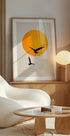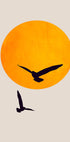 En minimalistisk illustrasjon av to fugler som svever foran en glødende oransje sol mot en enkel bakgrunn. Dette moderne og skandinavisk-inspirerte kunstverket gir en rolig og luftig stemning, perfekt for å skape en lys og fredelig gallerivegg.