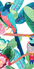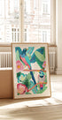 En fargerik illustrasjon av to eksotiske fugler som sitter blant frodige tropiske blader og blomstrende blomster. De sterke fargene og den lekne komposisjonen skaper et lyst og forfriskende kunstverk, perfekt for å gi liv til enhver gallerivegg.