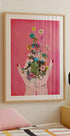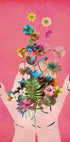 Et livlig og moderne kunstverk som viser hender som slipper løs en eksplosjon av fargerike blomster og blader mot en rosa bakgrunn. Den florale collaget blander natur og kreativitet, og symboliserer vekst, fornyelse og skjønnhet. Perfekt for moderne interiører med et snev av botanisk sjarm.
