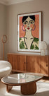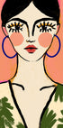 En livlig og stilfull moteporträttplakat av en kvinne med markerte øyevipper, store øreringer og elegante farger. Den ferskenfargede bakgrunnen og de maleriske teksturene gir et moderne kunstnerisk preg, som gjør den til et iøynefallende verk i moderne interiører.