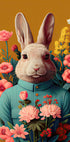 En fantasifull og sjarmerende plakat som viser en kanin i en turkis jakke omgitt av blomstrende blomster. Den lekne komposisjonen kombinerer vintageillustrasjon med surrealistisk fantasi, perfekt til barnerom, lekerom eller for alle som elsker humoristiske dyreportretter.