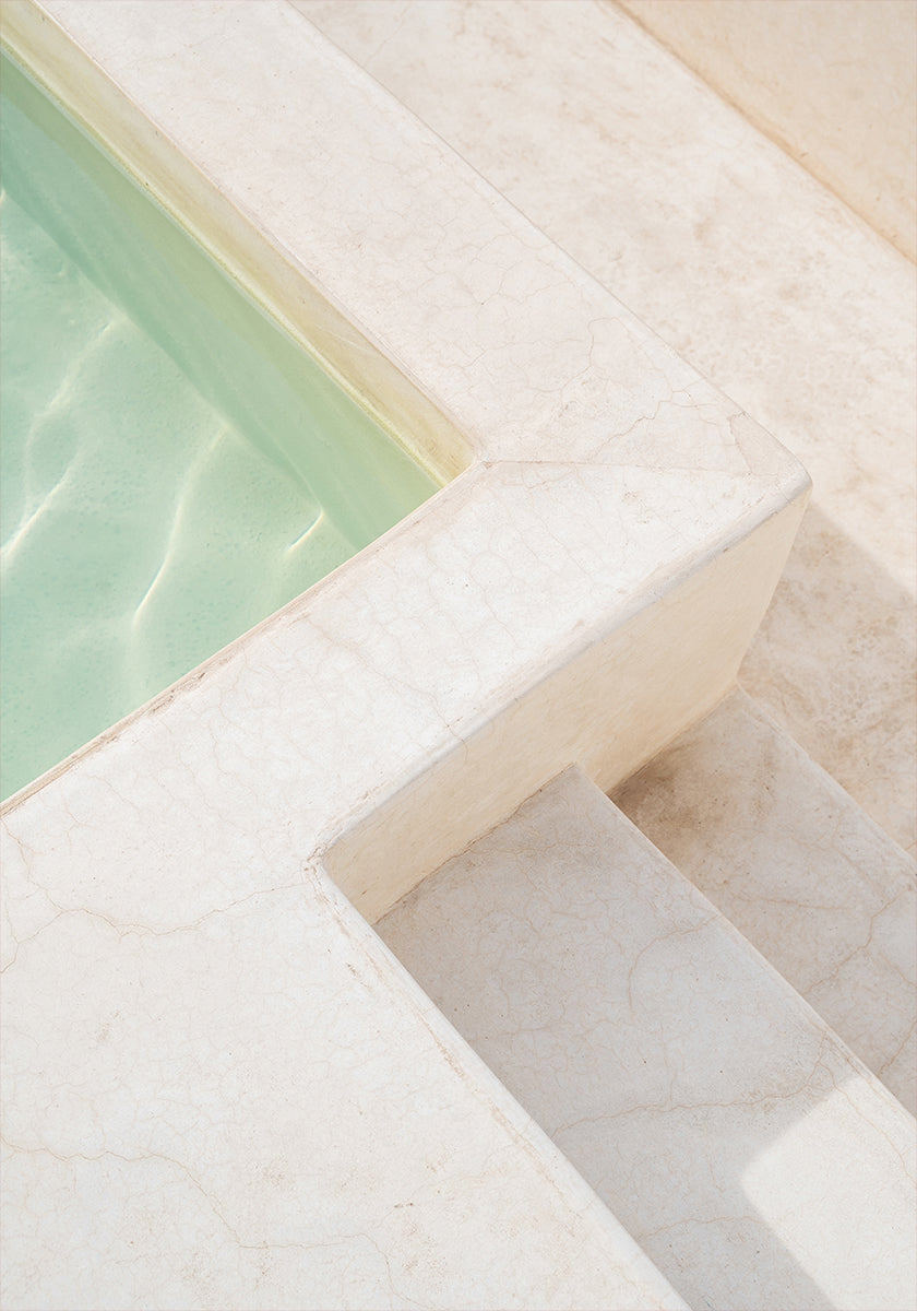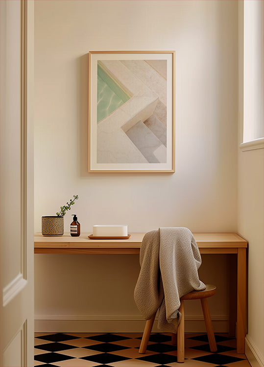By the Pool av Henrike Schenk fanger en stille siesta ved bassengkanten i Marrakech: turkis vann som glitrer, varme beige betongflater og skarpe skygger som tegner rytmiske, grafiske linjer. En minimalistisk, marokkansk stemning som gir rommet ro, lys og ferievibber – perfekt for stue, gang eller soverom.