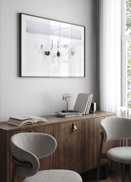 Calligraphic ballet av Larry Deng APA skildrer rødkronede traner som danser i snødis på Hokkaido. Høy-nøkkel lys, kalligrafiske linjer og blekkaktige strøk gir en poetisk ro, mens en rød aksent balanserer det svart-hvite. Et zen-inspirert øyeblikk av stillhet, grace og nordisk minimalisme. Inspirert av japansk vinterpoesi.