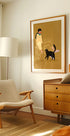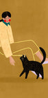 En moderne illustrasjon av en kvinne og hennes svarte katt, laget i varme nøytrale toner med en minimalistisk, men stilisert estetikk. Dette kunstverket utstråler komfort, fellesskap og kjærlighet – perfekt for koselige interiører og katteelskere.