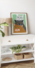 En dristig og moderne illustrasjon av tre stiliserte katter stablet sammen i et lekent portrett. Med uttrykksfulle værhår, livlige øyne og en fargerik grafisk design er dette kunstverket perfekt for katteelskere og tilfører en quirky, moderne stemning til ethvert rom.