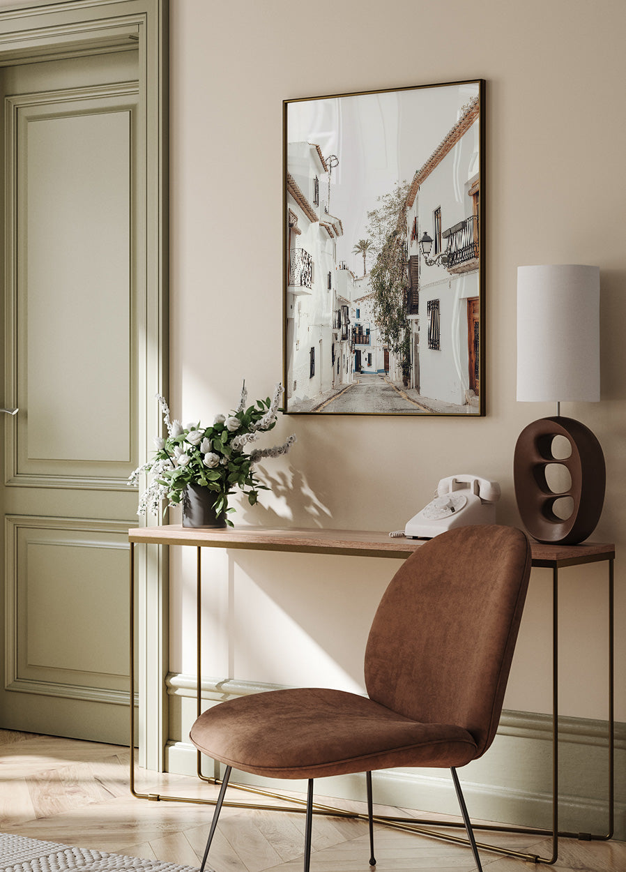 Bilde av en smal gate i en lys, hvit landsby med tradisjonell arkitektur. Husene har balkonger i smijern og små vinduer med persienner. En palme titter frem i bakgrunnen, og en stor grein henger ned fra et tre. Gaten er asfaltert og fører mot en uskarp bakgrunn, noe som gir en rolig og idyllisk atmosfære.