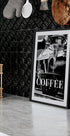 En dristig svart-hvitt plakat med ordet "COFFEE" kombinert med et nærbilde av en espressomaskin som heller fersk kaffe i en kopp. Perfekt for kjøkkenvegger, kaffebarer eller kafeer, dette minimalistiske typografiske designet kombinerer inspirasjon med en stilig monokrom estetikk.