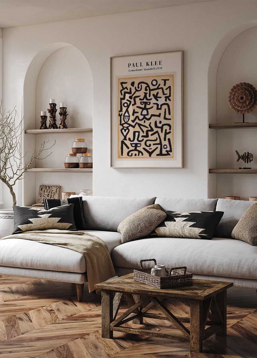 Plakaten viser et abstrakt kunstverk av Paul Klee fra 1938 med tittelen "Comedians' Handbill". Den inneholder en samling av stiliserte figurer og linjer i svart og nude toner mot en lys bakgrunn. De geometriske formene og de lekne linjene skaper en visuell dialog, som evokerer både humor og refleksjon, typisk for Klees unike stil.