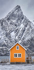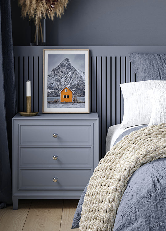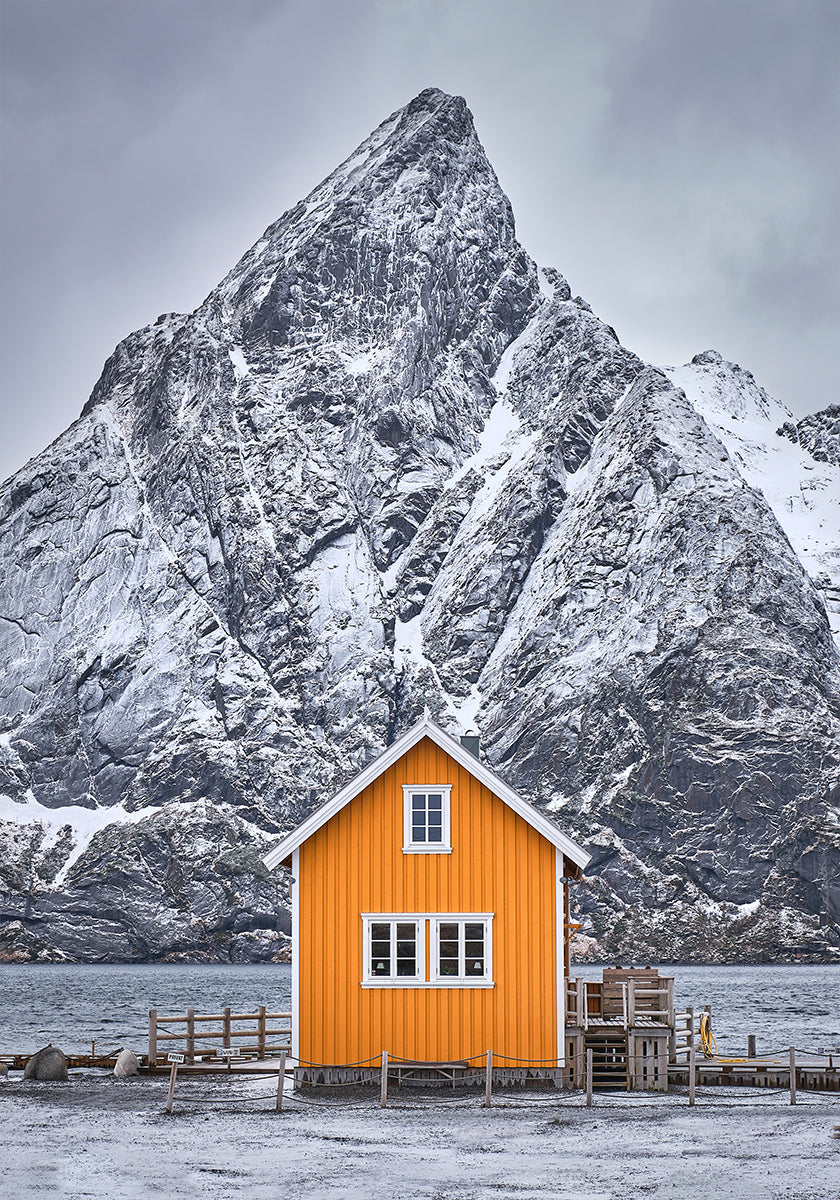 Et stemningsfullt nordisk vintermotiv av Hamed Bank: en enslig gul hytte ved havkanten, omkranset av snødekte topper og dramatisk, skyet himmel. Det kjølige lyset og de rene linjene skaper ro og kontrast, med følelsen av stillhet, vidde og eventyr langs kysten. Perfekt for moderne, skandinavisk interiør og alle som drømmer om kalde horisonter.