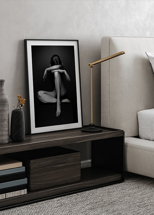 Et sterkt kunstfotografi i svart-hvitt av en sittende kvinne, som uttrykker rå følelser, sensualitet og sårbarhet. Med dramatisk lyssetting og monokromt uttrykk fremkaller kunstverket temaer som sorg, styrke og melankoli, og blir et iøynefallende figurativt veggkunstverk.