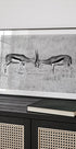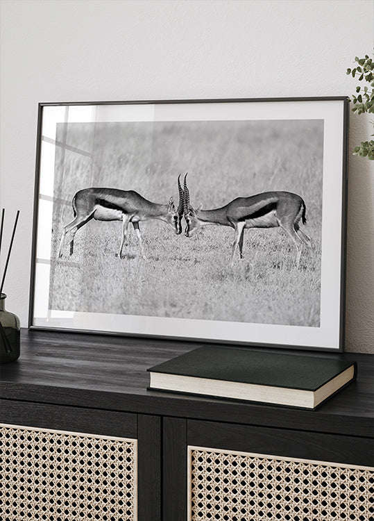 Et sterkt svart-hvitt dyrebilde av to gaseller som står ansikt til ansikt i en duell, der hornene deres kolliderer i styrke og utfordring. Fanget på den enorme Serengeti-savannen, formidler dette bildet rå energi, overlevelse og villmarkens tidløse ånd.
