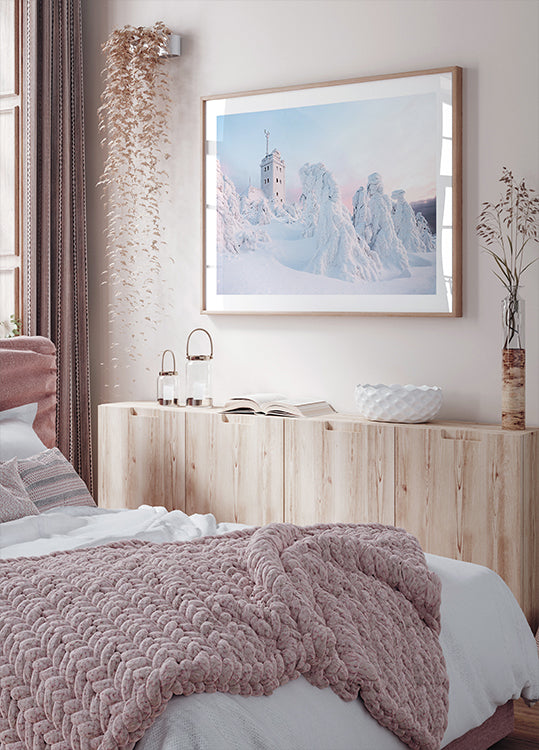 Et isdekket tårn ruver over snødekte trær på Fichtelberg i Erzgebirge, Tyskland. Dis og vinterlys gir scenen et rolig, nesten eventyraktig preg, der frost og struktur tegner grafiske linjer i landskapet. En stemningsfull vinterstudie, fotografert av Christoph Schaarschmidt. Kalde blåtoner og stillhet fremhever frostens skulpturer.