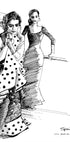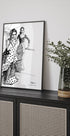 Pulserende plakat av Awol Art Alex: to flamencodanserinner i flytende kjoler med polkadotter, fanget i et livlig øyeblikk mellom Sevilla-natt og kastanjett-rytmer. Skisseaktige linjer og dristige kontraster gir bevegelse, varme og spansk eleganse – perfekt for å fylle veggen med energi. Inspirert av Andalucía og Barcelonas pulserende gater.