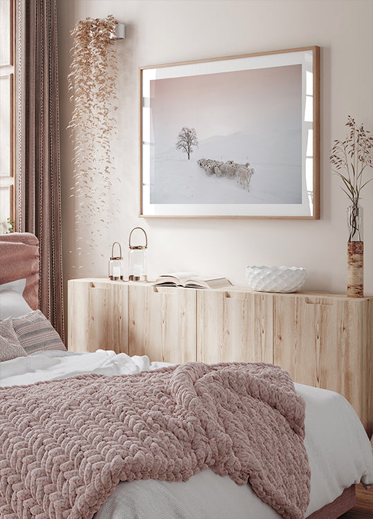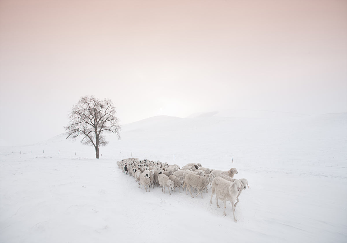 En flokk sauer leter etter mat i et snødekt landskap, mens et ensomt tre vokter horisonten under en svak, pastellrosa himmel. Frosten ligger som et slør over åkeren, og sporene i snøen forteller om stillhet og utholdenhet. Motivet av Bingo Z fanger roen og det pastorale vinterlyset i landlige omgivelser.