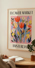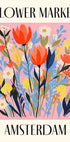 En fargerik plakat i retrostil med sterke tulipaner og villblomster mot en livlig rosa bakgrunn. Inspirert av de berømte blomstermarkedene i Amsterdam, kombinerer dette kunstverket reise-nostalgi med botanisk sjarm, perfekt for å gi liv til ethvert interiør.