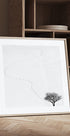En poetisk svart-hvitt-skildring av vinterens stillhet: fotspor snor seg over det frosne snølandskapet mot et ensomt tre under åpen himmel. Kontrastene gir dybde og ro, mens de rytmiske sporene antyder en usett reise. Motiv av fotografen Mostafa Nodeh – perfekt for nordisk minimalisme. Skaper et rolig fokus i stue, gang eller kontor.