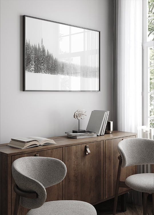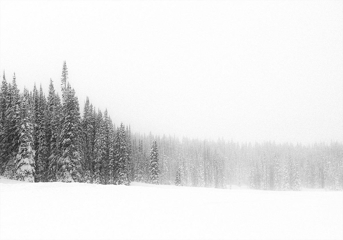 Forest for the Trees av Kirk Cypel skildrer en stille, snødekt skog der slanke stammer forsvinner i tåkedis. Den dempede, nesten monokrome paletten fremhever rytmen i trerekker og gir motivet en meditativ ro. Et stemningsfullt landskap som inviterer til stillhet, refleksjon og vinterlig undring. Perfekt for nordisk minimalisme.