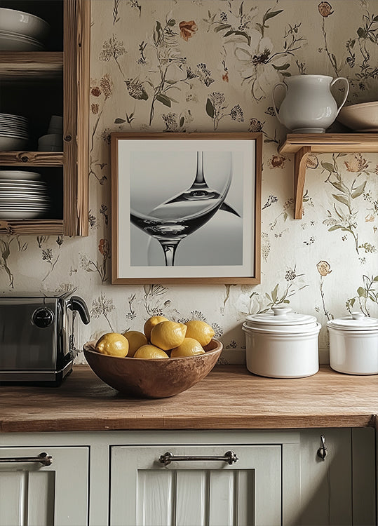 Two wine glasses become geometry in black and white: one upright, one inverted, their arcs mirroring through crisp light and soft shadow. Negative space breathes between them, creating a poised still life that feels modern and intimate—perfect balance, quiet drama, and a refined sense of calm and poise.