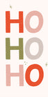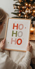 En leken og moderne juleplakat fra Menina Lisboa: store, grafiske HO HO HO-bokstaver i dristig typografi og festlige røde, grønne og rosa toner. Minimalistisk uttrykk med maks julestemning, perfekt til stue, kjøkken eller barnerom – alene som statement, eller som del av en fargerik gallerivegg.