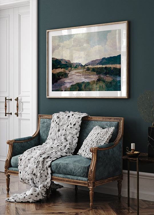 Kernow Stream av Dan Hobday fanger et rolig skogsterreng der en bekk slynger seg gjennom trærne i myke, moderne penselstrøk. Dempet palett og subtile teksturer gir en tidløs, nesten nostalgisk stemning. Et minimalistisk landskap som balanserer bevegelse og stillhet i elegante flater. Perfekt som rolig blikkfang i hjemmet.