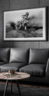 En kraftfull svart-hvit fotoplakat av en motocrossfører som skjærer gjennom jord i full fart. Den dramatiske jordsprekken og energien fanger spenningen, intensiteten og friheten i ekstremsport. Perfekt veggkunst for motorsportfans og adrenalinelskere.
