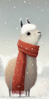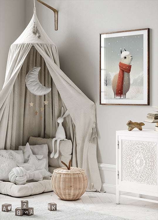 En stemningsfull vinterplakat av Bilge Paksoylu: en rolig lama står i et snødekt, landlig landskap, omgitt av frost og stille himmel. Myke, dempede toner gir et poetisk, pastoralt uttrykk som passer både barnerom og stue, og bringer en lun, nordisk ro til veggen. Et hint av humor gjør motivet lett å elske og tidløst.