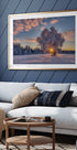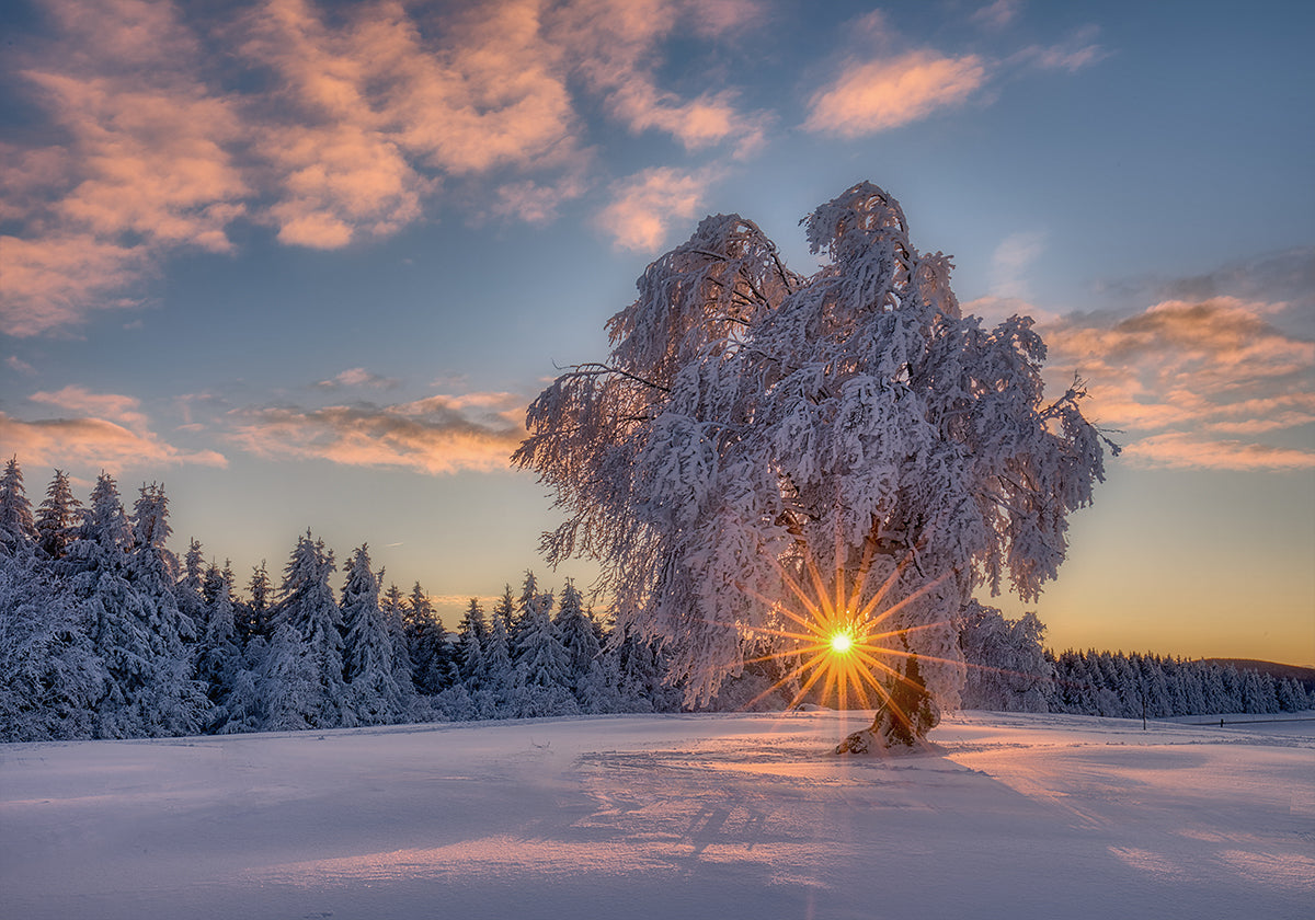 En krisp vintermorgen fanges i «morning star» av Judith Kuhn: solens stjerneglans bryter gjennom rimdekte trær på Schauinsland, mens blå himmel og lette skyer hviler over et snødekt landskap. En stemningsfull naturplakat som gir rommet friskhet, stillhet og eventyr. Perfekt for vinterelskere og dem som drømmer om klare fjelldager.