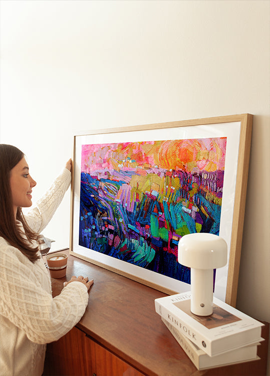 - Trykkes på slitesterkt bomullslerret med naturlig tekstur