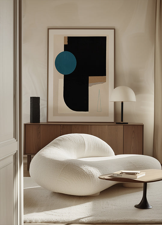 Noche Oscura I av Ildefonso Martín utforsker nattens stillhet med en dyp blå sirkel som svever mot en mørk, teksturert collage. Subtile blyantspor og geometriske kontraster skaper et meditativt fokuspunkt som balanserer ro og spenning—perfekt for moderne interiører og grafisk minimalisme. Som inviterer til rolig ettertanke.