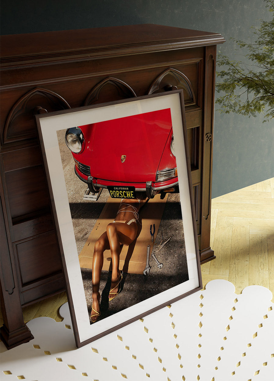 En dristig og stilig kunstplakat som viser en kvinne i bikini som jobber under en klassisk rød Porsche med en California-skiltplate. Sollyset skaper dramatiske skygger over scenen og fremhever den vintage bilsjarmen kombinert med moderne sensualitet. Perfekt for bilentusiaster og kunstelskere.