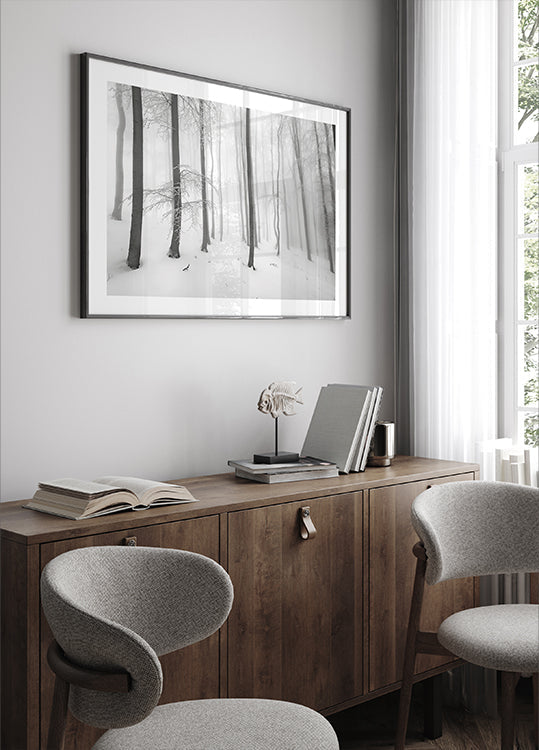 En stille, tåkefylt vinterscene fra bøkeskogen fanger øyeblikket der snø, rim og dis smelter sammen. Nakne stammer og fine greiner tegner grafiske linjer i det dempede lyset. Tom Pavlasek inviterer til kontemplasjon med et motiv som utstråler nordisk ro, dybde og tidløs eleganse. Perfekt for rolige rom og naturinspirerte hjem.