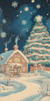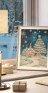 En nostalgisk vinterby i snødrakt: lune husfasader med varme vinduslys omkranser et pyntet juletre på torget, mens lette snøfnugg faller stille over gater og tak. Den maleriske, retro paletten og små, tidløse detaljer skaper en rolig juleatmosfære som inviterer til hygge og forventning. Perfekt som sesongens midtpunkt på veggen.