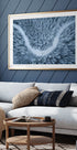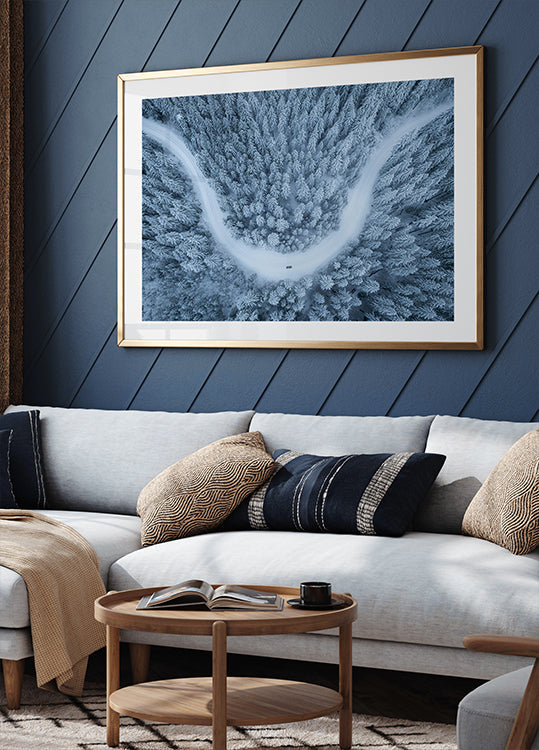 Snowy drive av Gerald Macua fanger et luftig vinterøyeblikk fra oven: en snølagt vei skjærer gjennom tette furutrær mens biler glir stille forbi. Kontrasten mellom mørk asfalt og hvit snø skaper rytme og ro, og inviterer til reiselyst og ettertanke i et minimalistisk, nordisk uttrykk. Perfekt som blikkfang i stue, gang eller kontor.
