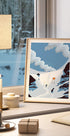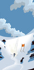 En retro-inspirert skiplakat som fanger suset fra alpinløypa: en modig løper skjærer gjennom puddersnø under dramatiske skyer, med majestetiske, blåtonede fjell som kulisse. Illustrasjonen av Nicholas oser reiselyst og vinterglede – perfekt som blikkfang i stue, hytte eller kontor. Retro reiseposter-stil med slalåmporter gir nostalgi og fart.