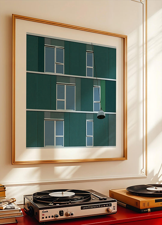 Street lamp (NEW) av Inge Schuster fanger en enslig gatelykt mot en lys, rolig himmel, rammet inn av stramme fasader. Rene linjer, gråtoner og en diskret grønn detalj skaper et minimalistisk, urbant uttrykk der lys og skygge danner rytme. Et stille blikkfang til moderne, nordiske rom. Perfekt for stue, kontor og entré.