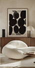 En slående, sort-hvit komposisjon av Janel Bragg der sumi-blekk danner organiske ovale og sirkulære former i dynamisk balanse. Høy kontrast og myke kanter skaper bevegelse, dybde og ro på samme tid—et moderne, grafisk blikkfang som gir rommet en meditativ, håpefull energi. Minimalistiske kontraster og flytende former gir en tidløs stemning.