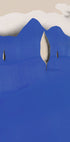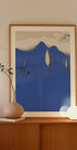 Et drømmende landskap i dype blåtoner: lagdelte fjell, frostkledde topper og stille skog som glir inn i en minimal, geometrisk komposisjon. Disige skyer og myke pasteller skaper ro og romfølelse. Et moderne, surrealistisk motiv av kunstneren Little Dean – perfekt for nordisk, elegant interiør. Henter følelsen av vinterlig stillhet.