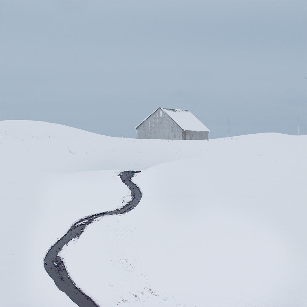 Opplev vinterens stillhet i «The cabin» av Xiang Wei: en enslig hytte ved en islagt bekk, omgitt av snødekte marker og bleke trær. Disig frostrøyk og myke skygger forsterker roen, mens den dempede paletten av hvitt og grått gir et tidløst, nordisk preg. Perfekt for å skape harmoni i hjemmet. Et stille landskap som inviterer til ettertanke.