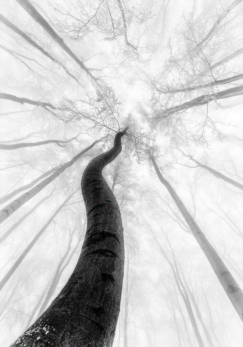 En tåkefylt vinterstemning brer seg gjennom en bøkeskog der snø og rim tegner myke konturer. Dempede, kjølige toner og lag av dis skaper dybde og ro, mens slanke trær leder blikket innover. Et poetisk naturmotiv av Tom Pavlasek som fanger stillheten mellom frost, skog og lys. Et hint av mystikk inviterer til ettertanke.