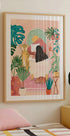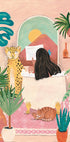 Woman taking bath in pink tropical bathroom