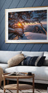 NingYun Ye fanger Huangshans vintermagi: snødekte, vridde furuer klamrer seg til granittklipper mens gyldent sollys bryter gjennom tåken og tegner dramatiske lysstråler over fjellryggen. En rolig, poetisk scene der frost, stillhet og dyp, sval tåke møter varm glød – perfekt for å gi rommet dybde og ro.