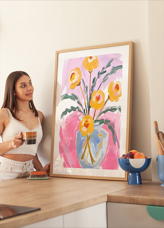 En rolig, botanisk stilleben: slanke stilker og myke blomster folder seg ut i luftige strøk, med skisseaktige linjer som gir bevegelse og moderne kant. Den balanserte negative plassen gjør motivet lett og tidløst – et poetisk blikkfang signert Ohkimiko, perfekt for zen-inspirerte, samtidsinteriører.